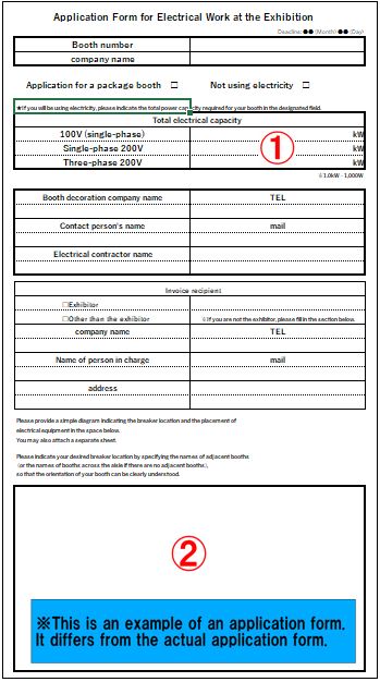 ・電気の入切は毎日御出展社様にて行っていただくため、展示台内等に設置希望の場合は扉付き等、メンテナンス可能な仕様にしておいてください。